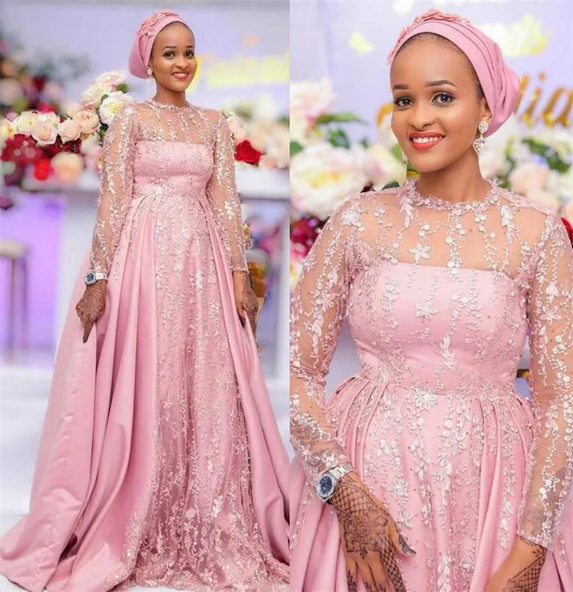 A satin or tulle ball gown with long sleeves and a high neckline for a regal touch.