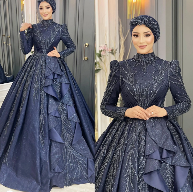 A classic floor-length gown with sequins, lace, or beadwork, paired with a matching embellished hijab.