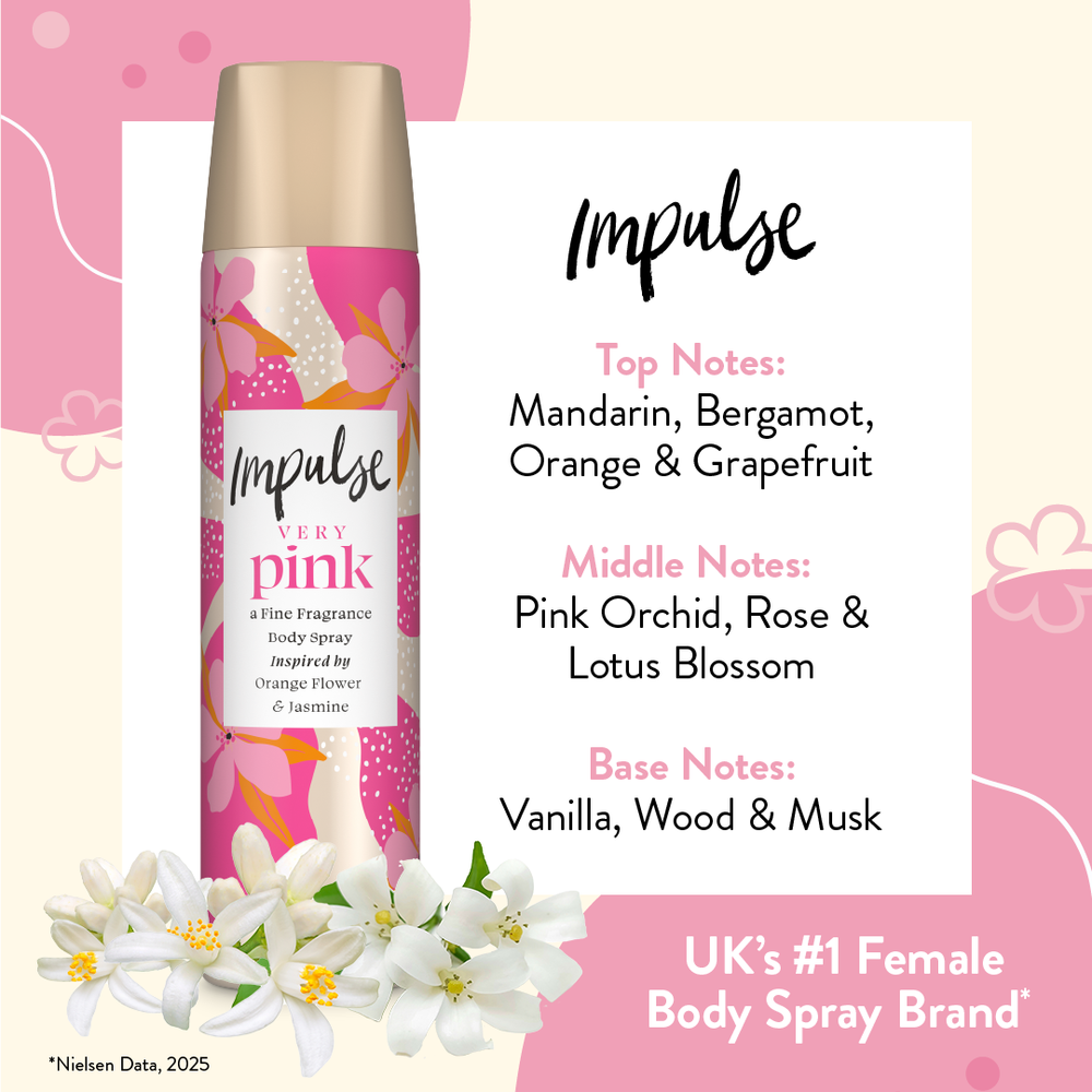 Fun, flirty, and fruity Impulse Very Pink is a hit among young women who want a vibrant, feminine scent on the go.